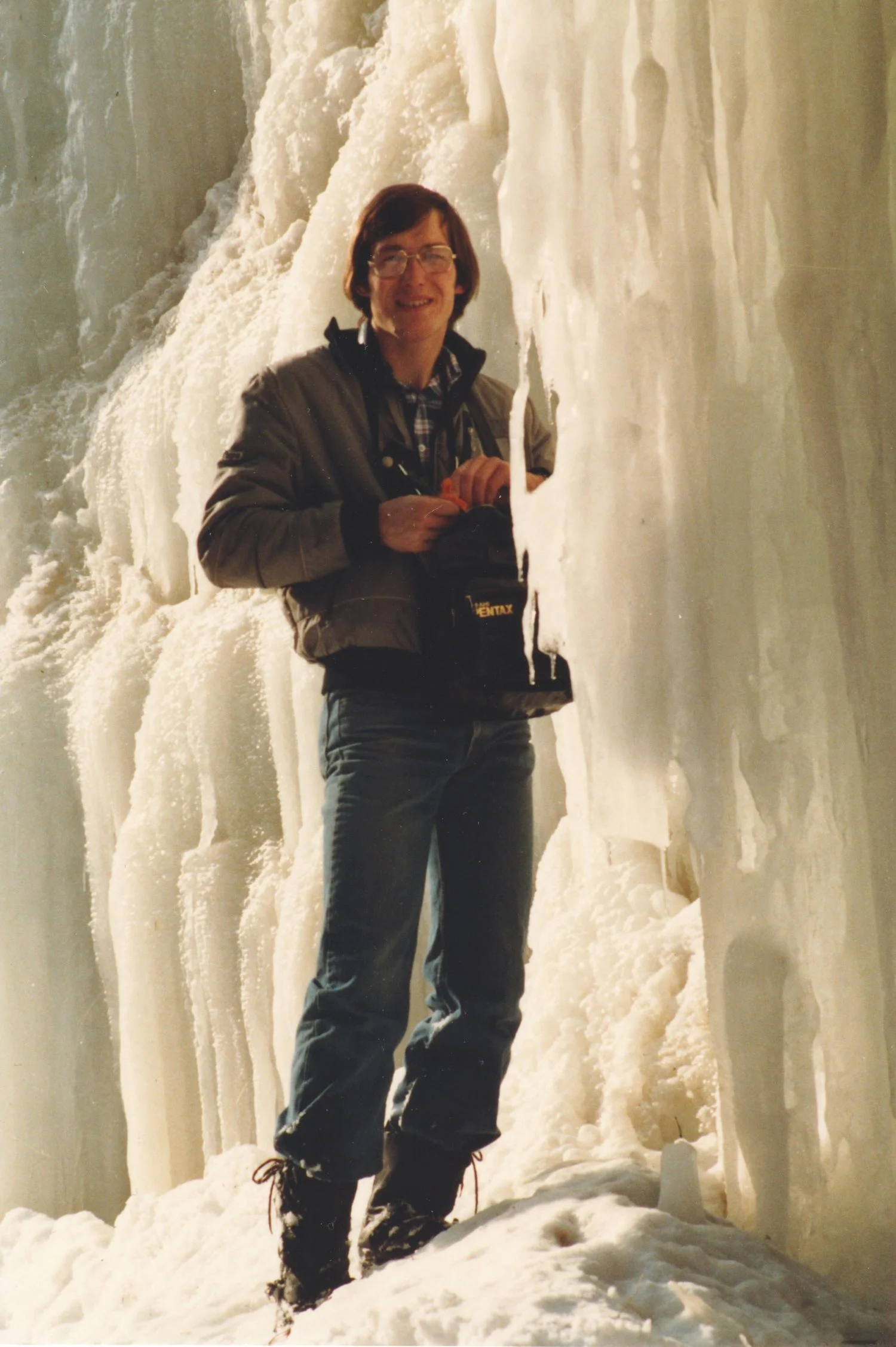 Original: oil on hardboard panel 29 3/4 x 17 1/2” (sold)Water trickling down the limestone cliffs of the Elora Gorge on the Grand River create frozen crystal columns.